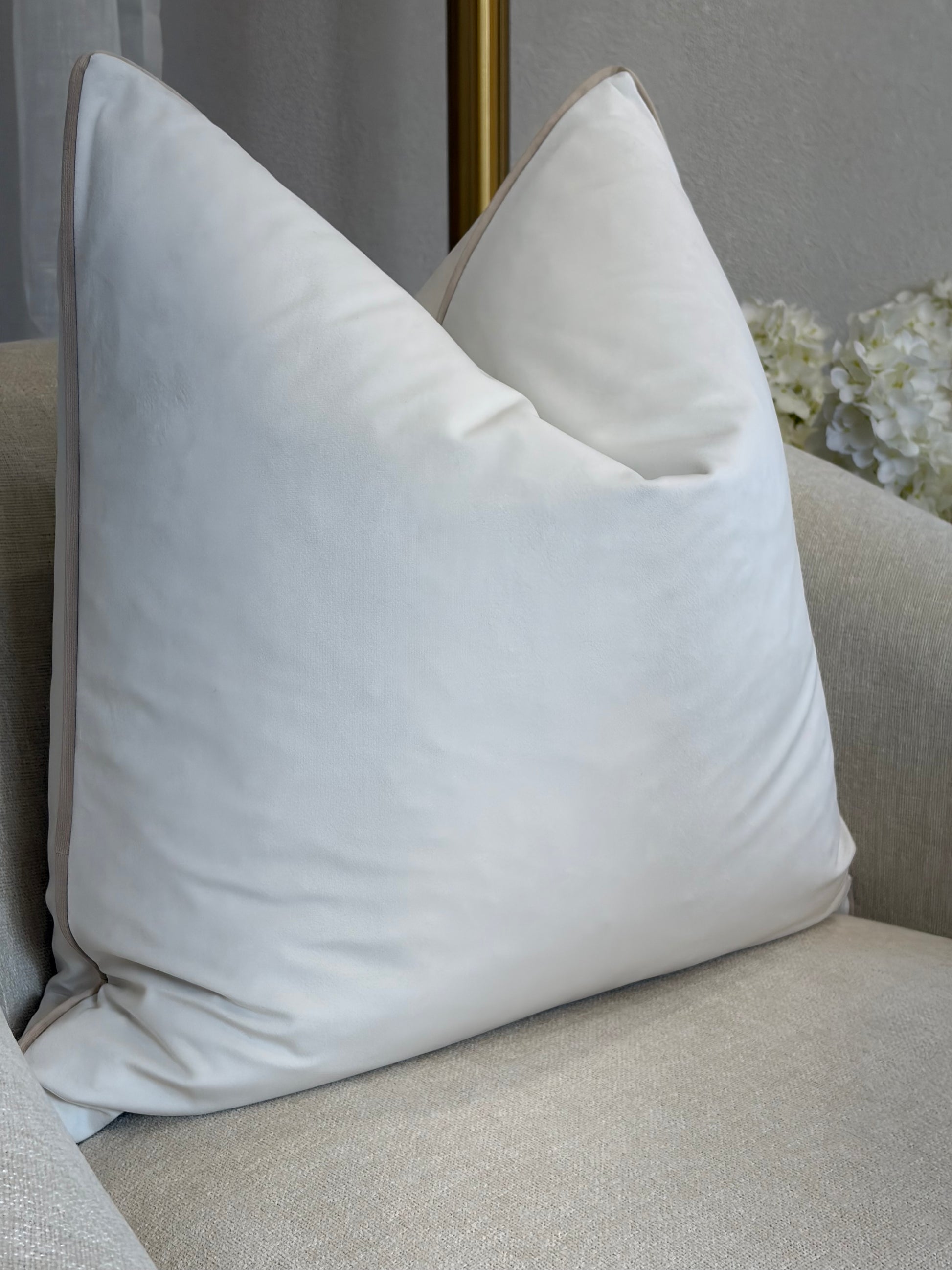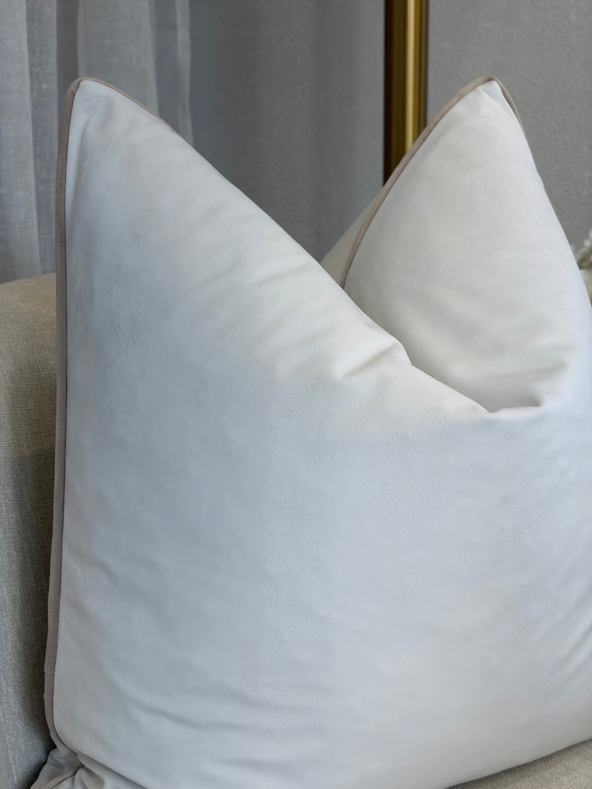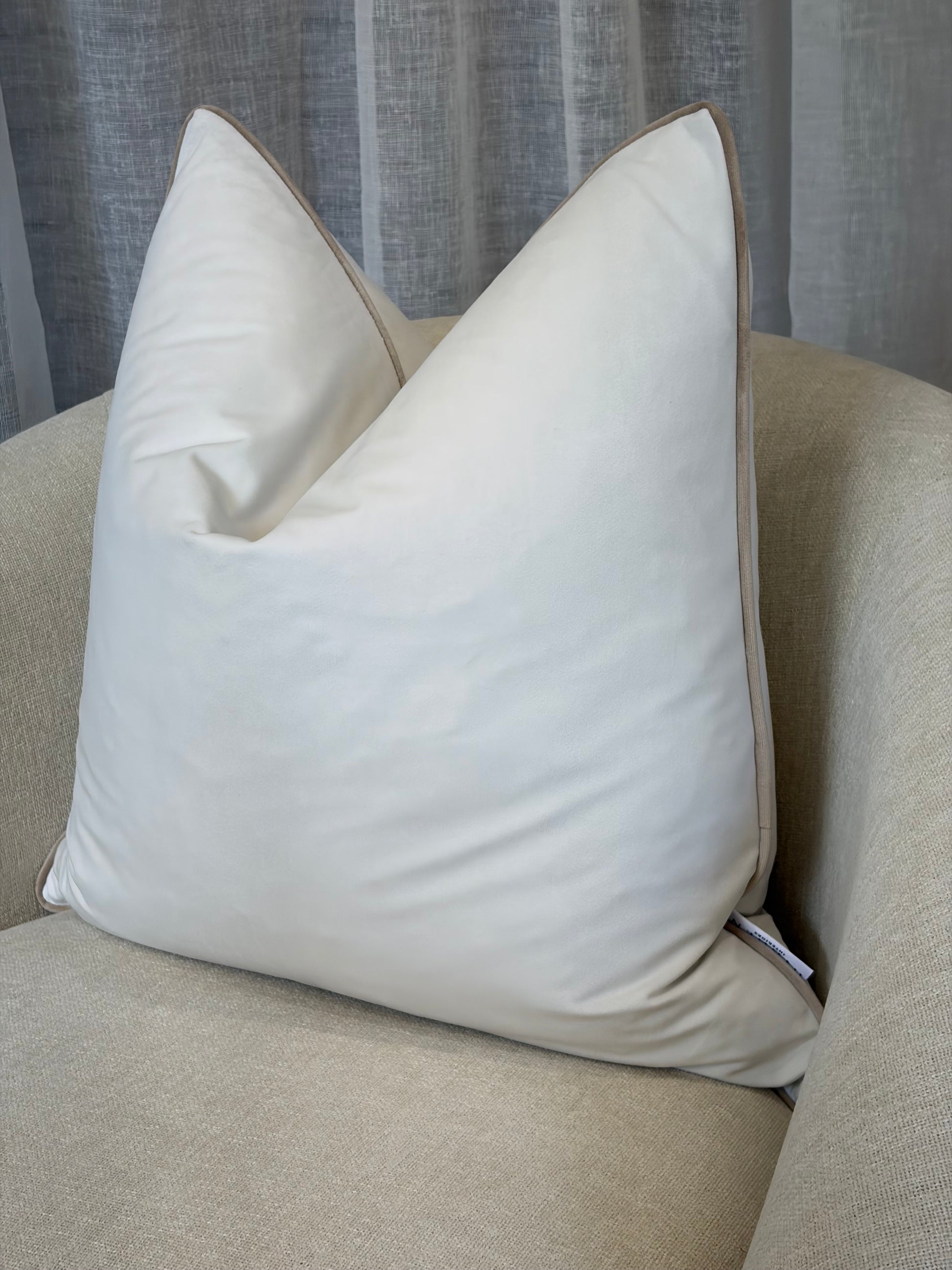Indulge in luxury with Ivy, the perfect addition to your home. This 55 by 55cm cushion is elegantly designed with a velvet cream fabric and mocha piping, bringing a touch of sophistication to any room. Relax and unwind in style with Ivy.