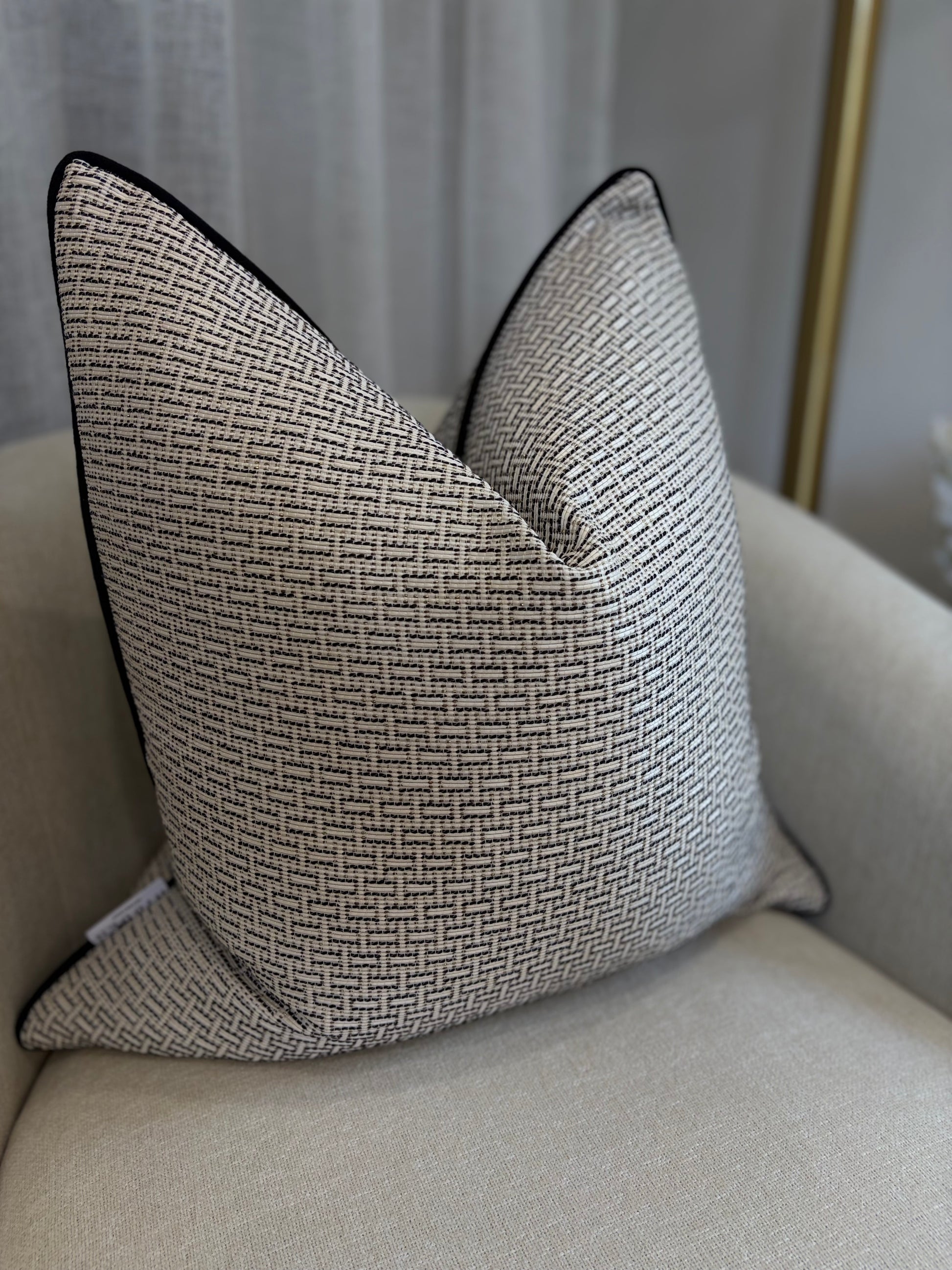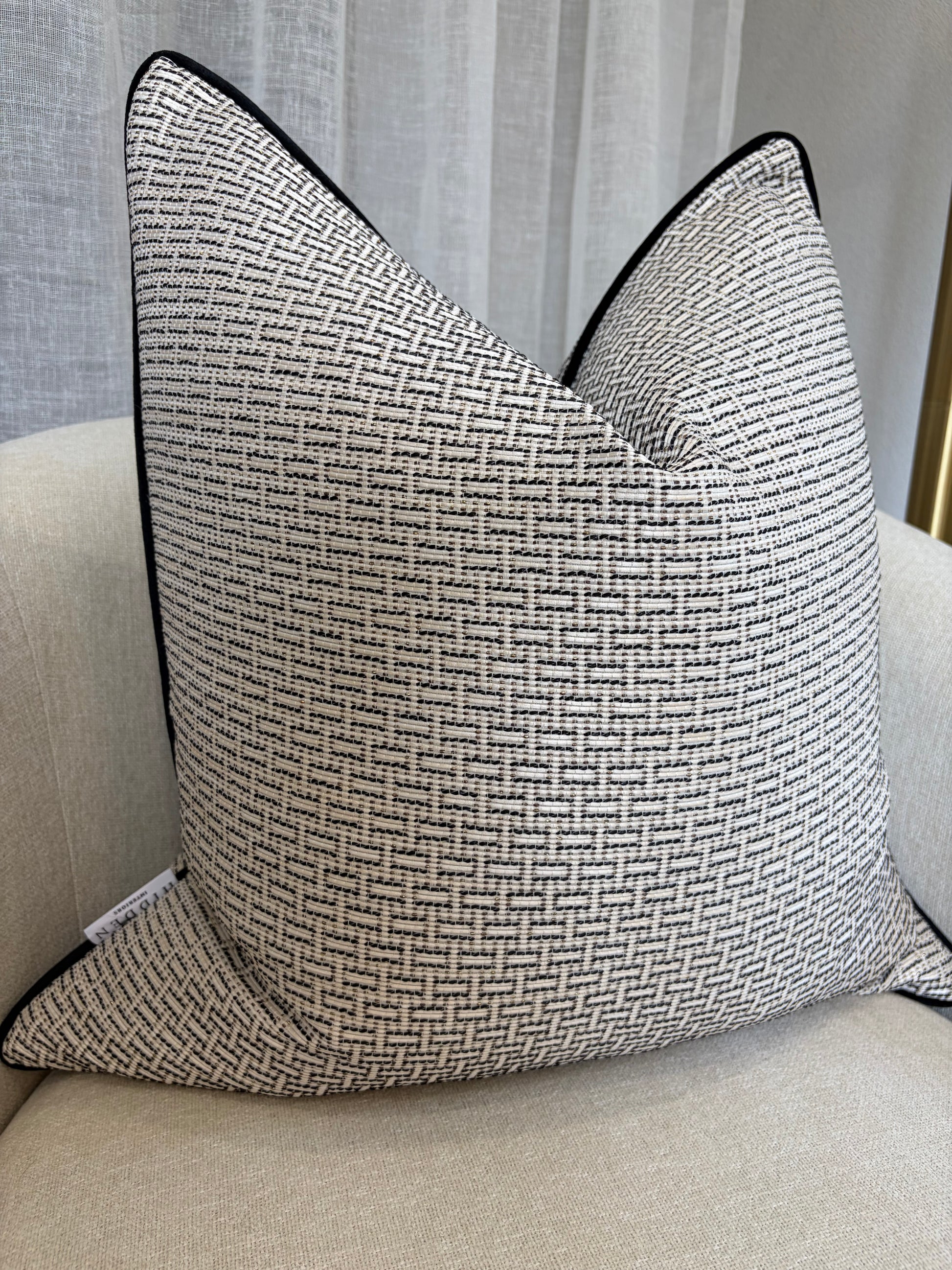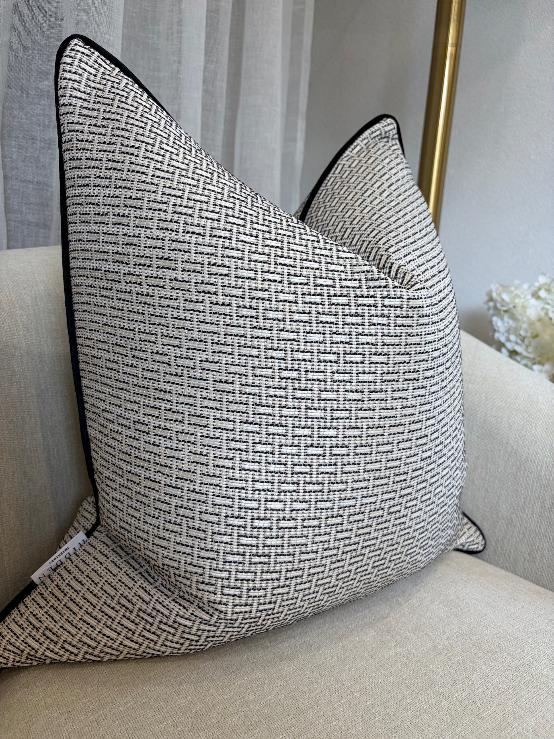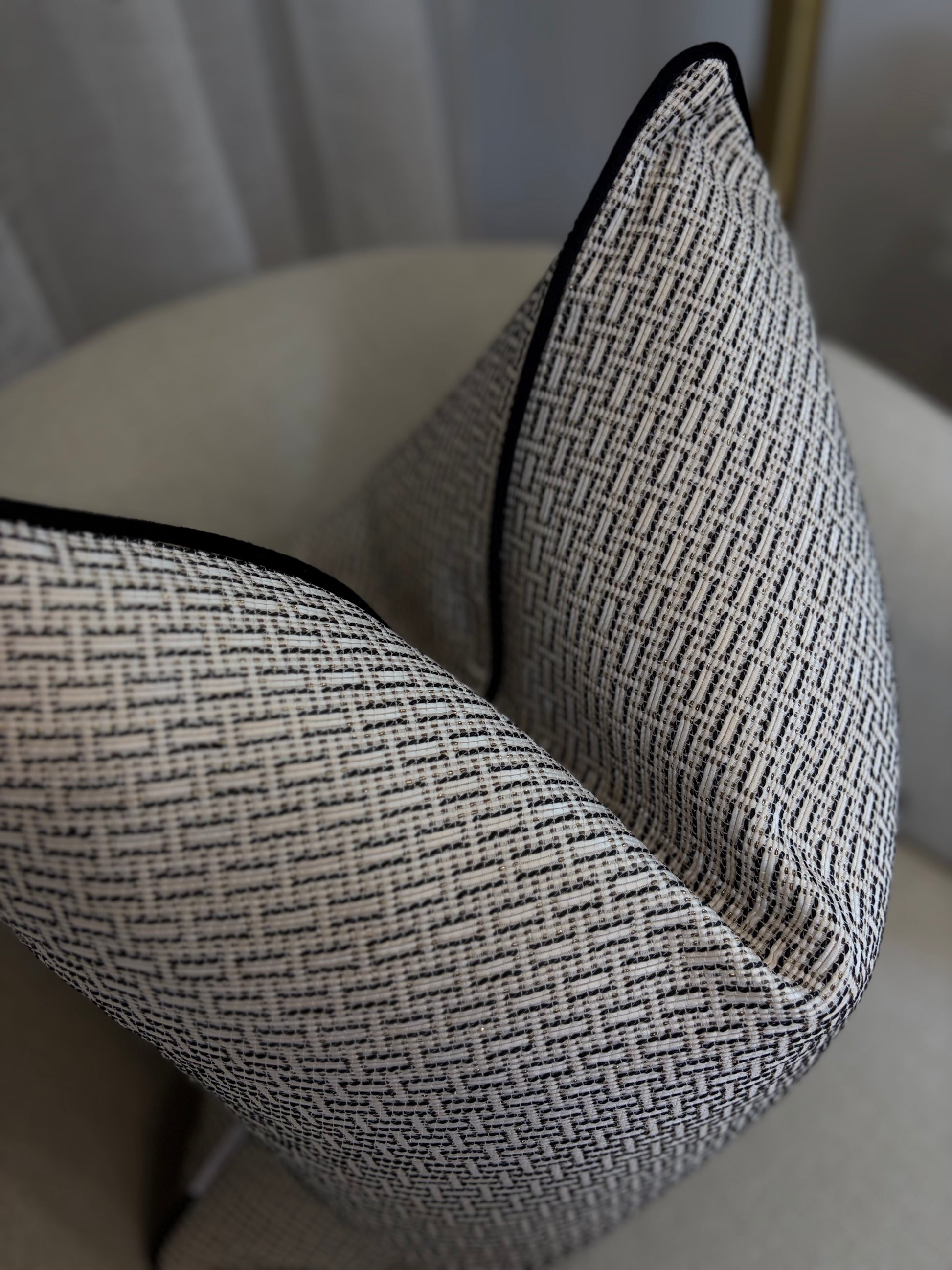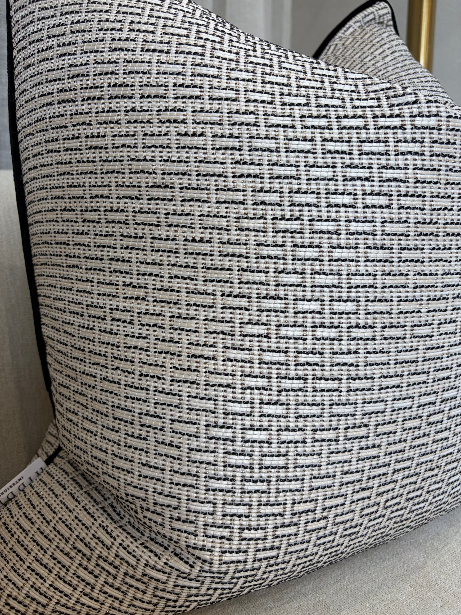 Introducing Adele - the luxurious 55 by 55 cushion featuring a sleek black, white, and gold design. Made from high-quality materials, this cushion adds a touch of elegance and comfort to any room. Create a sophisticated and stylish space with Adele.