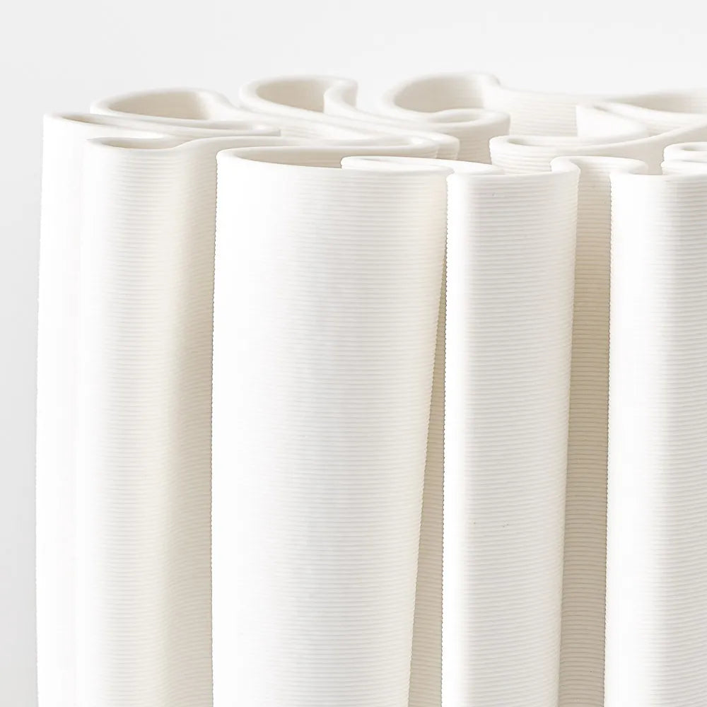 This very impressive sculptural 3D-printed vase in ivory is perfect for faux flowers or as a decorative piece. For adding water, simply insert a small waterproof vessel inside the pot.